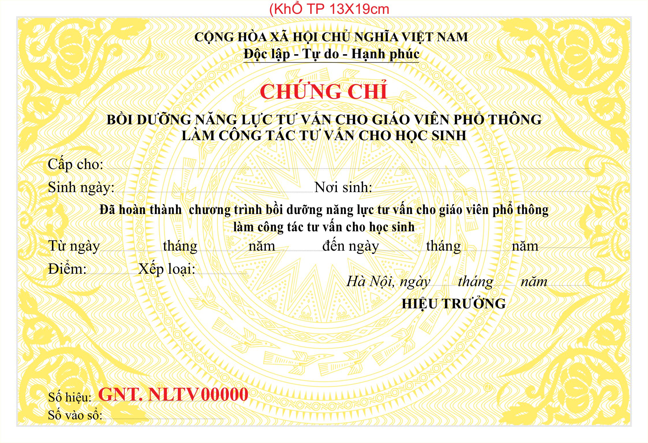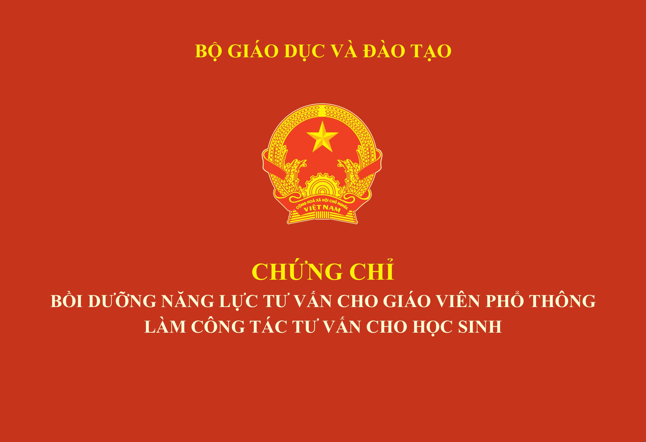Mẫu phôi chứng chỉ bồi dưỡng năng lực tư vấn cho giáo viên làm công tác tư vấn cho học sinh