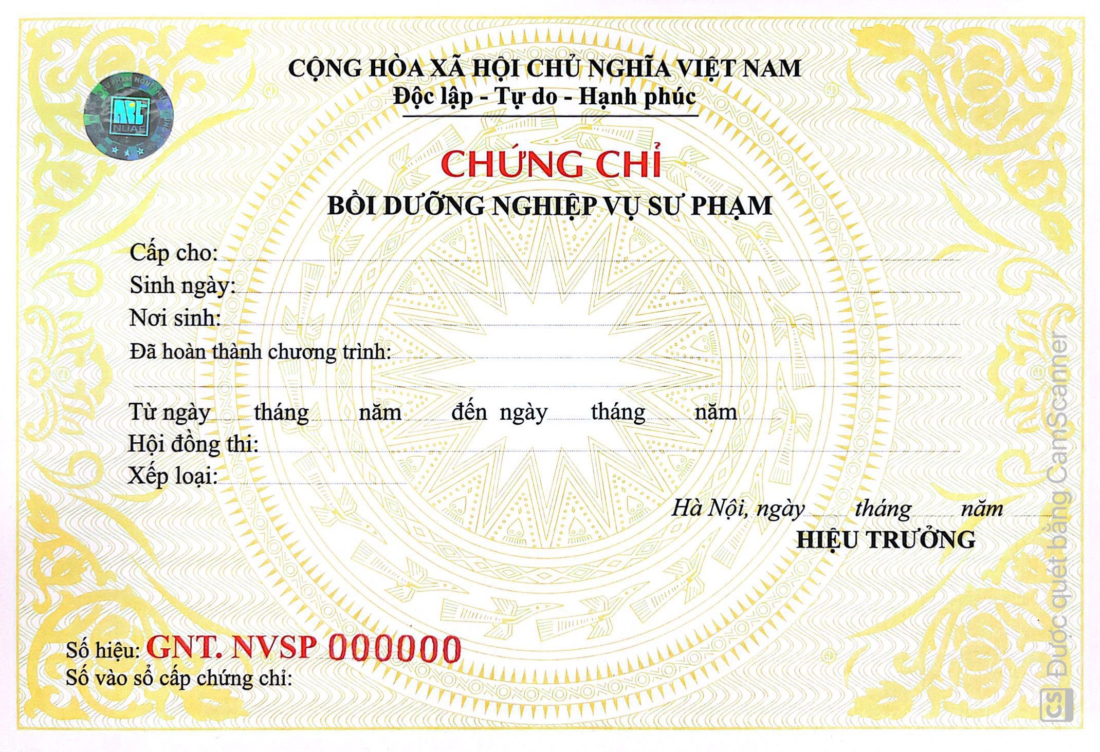 Mẫu phôi chứng chỉ Nghiệp vụ sư phamss