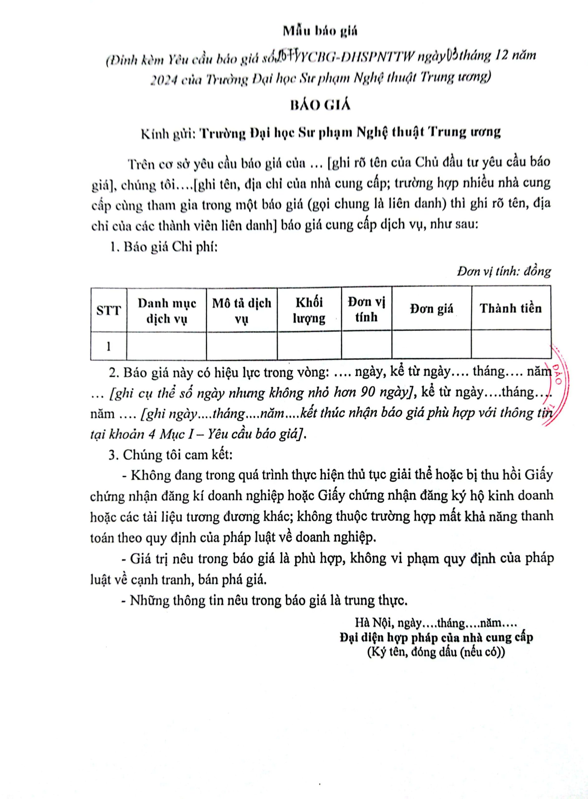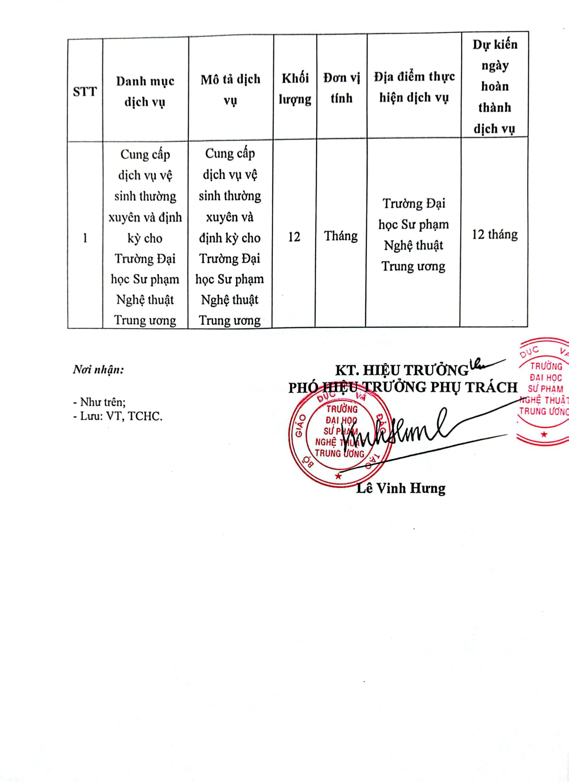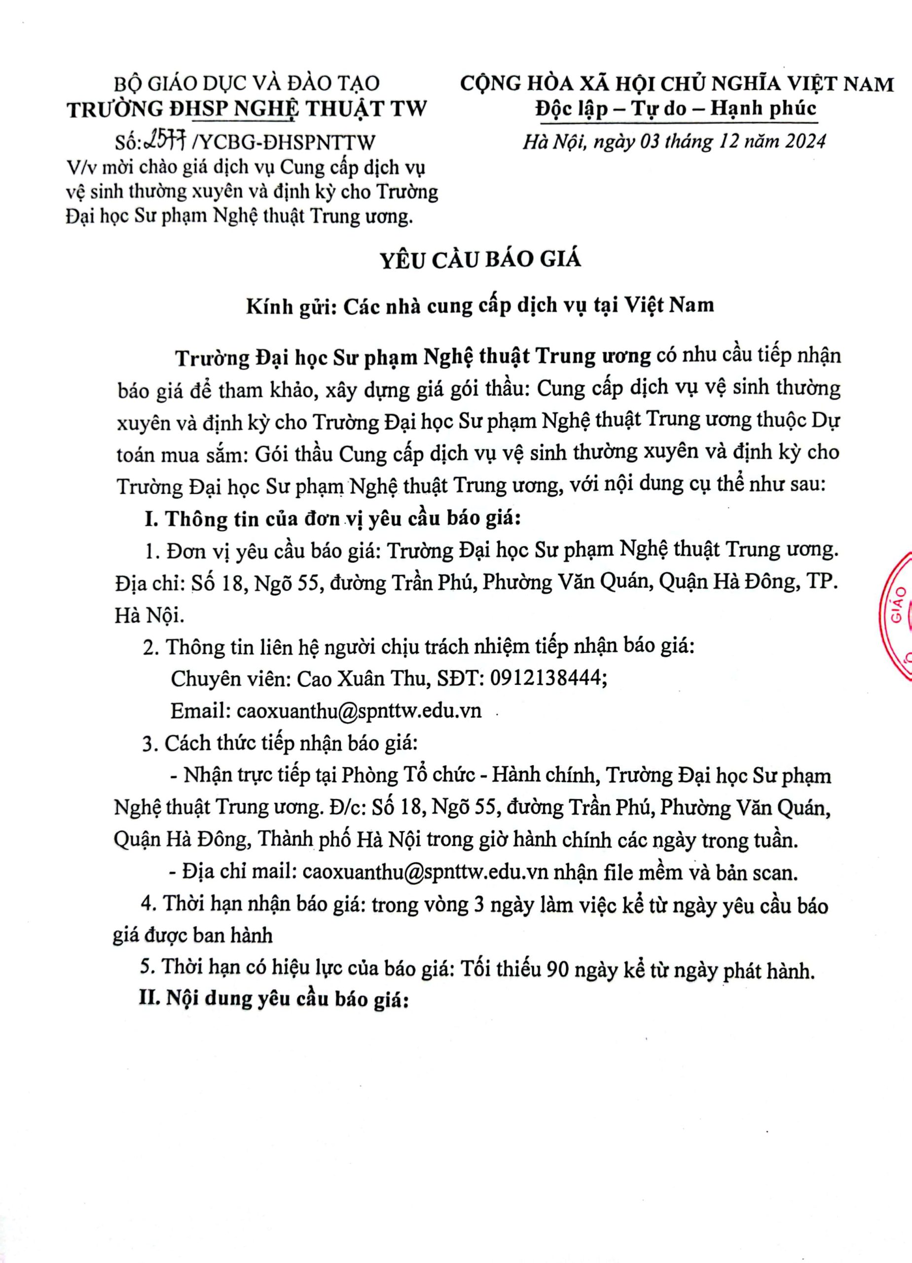 Công văn số: 2577/YCBG – ĐHSPNTTW V/v mời chào giá dịch vụ Cung cấp dịch vụ vệ sinh thường xuyên và định kỳ cho Trường